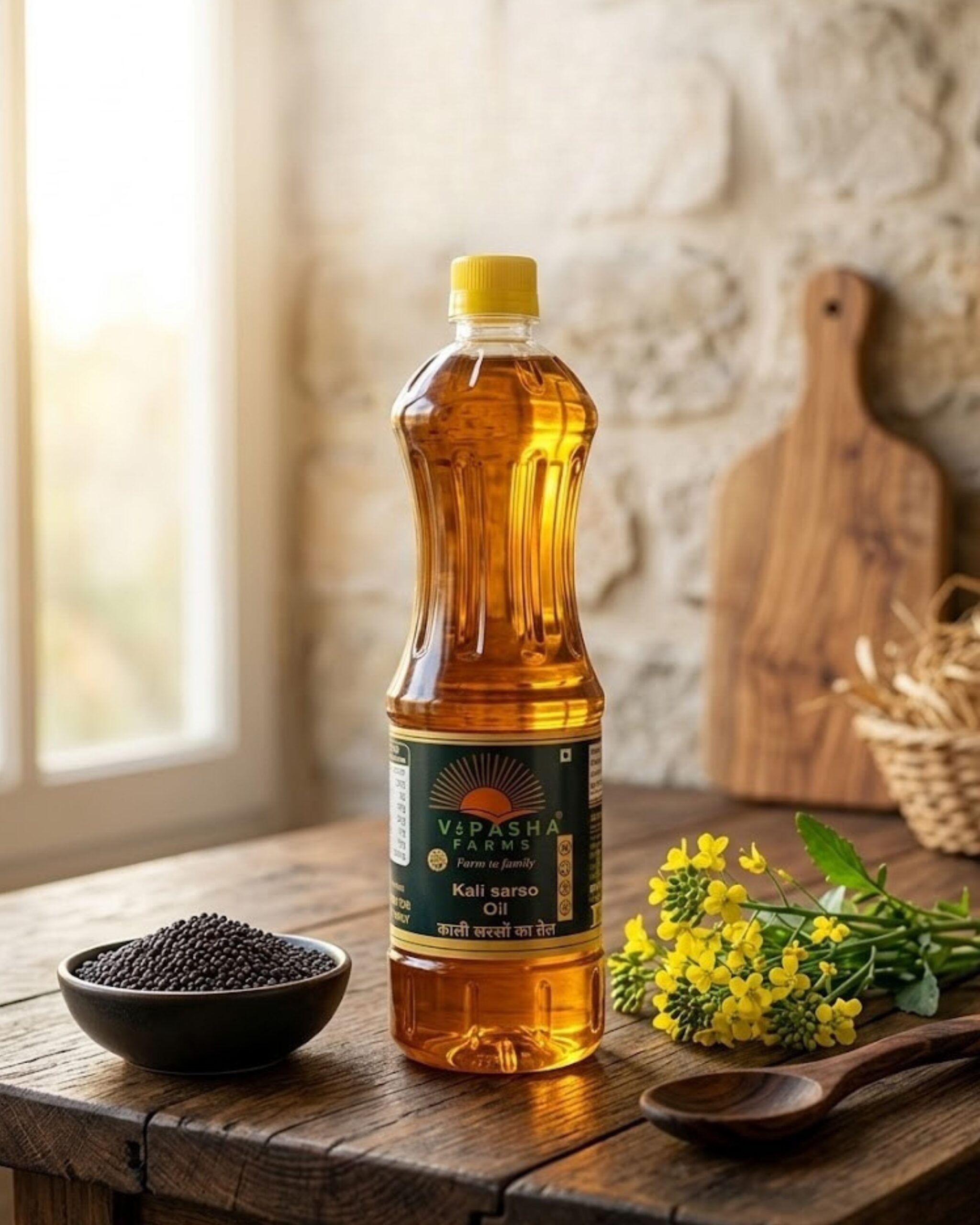 Vipasha Farm’s organic black mustard oil is a premium, cold-pressed oil made from 100% organic mustard seeds, grown without synthetic pesticides. Rich in natural antioxidants and omega-3 fatty acids, this oil offers both nutritional and therapeutic benefits. Whether used in cooking for its robust flavor or applied for skin and hair nourishment, it provides a pure, chemical-free option for health-conscious individuals. Vipasha Farm ensures each bottle contains only the purest mustard oil, with no added preservatives, making it a perfect choice for a wholesome lifestyle.